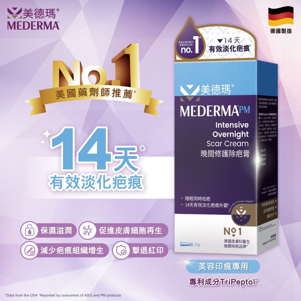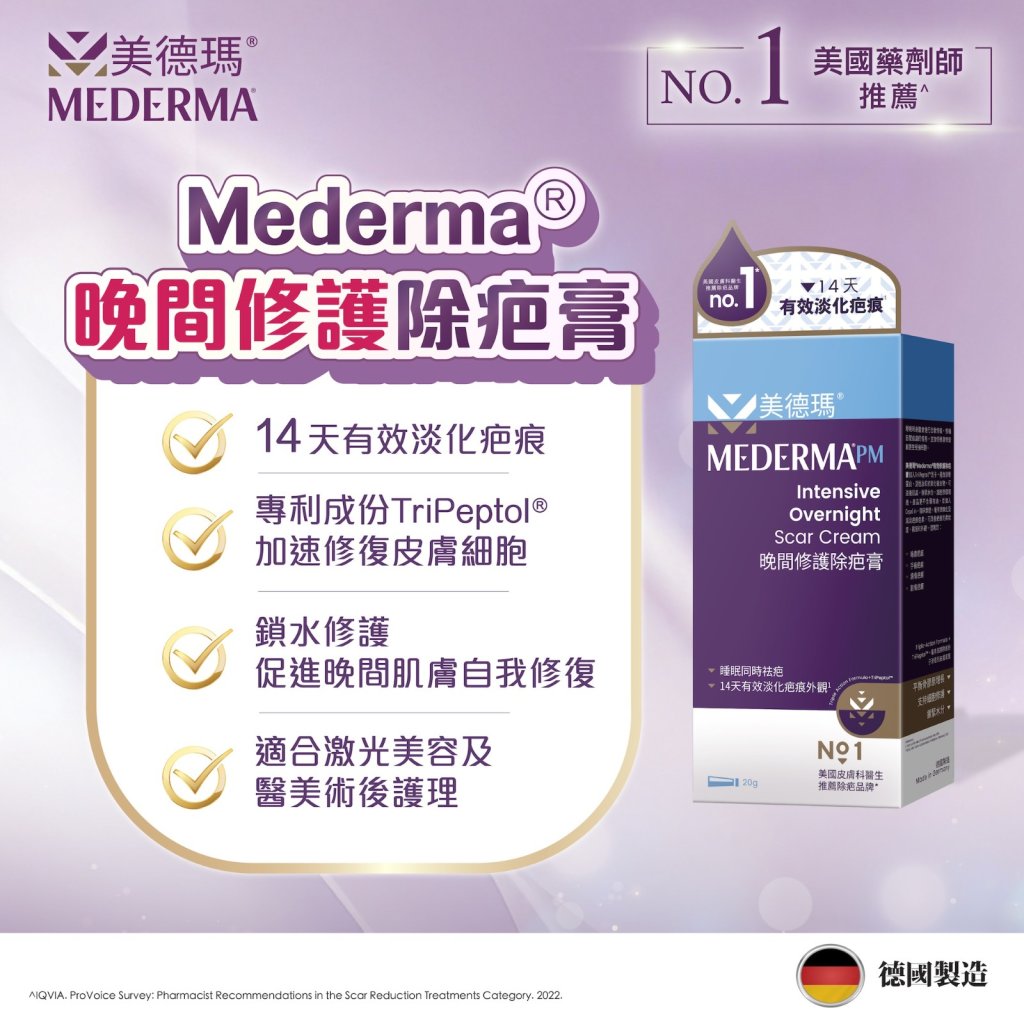 美德瑪®Mederma®晚間修護除疤膏加入TriPeptol™因子,蘊含膠原蛋白、活性肽和抗氧化複合物,可滋養肌膚,鎖緊水份,加速修復疤痕。產品更不含礦物油,並加入Cepalin,臨床實證,能有效軟化及減淡疤痕色素,可改善疤痕的柔軟度、質感和外觀1,適用於: 暗瘡疤痕、手術疤痕、燒傷疤痕、割傷疤痕。