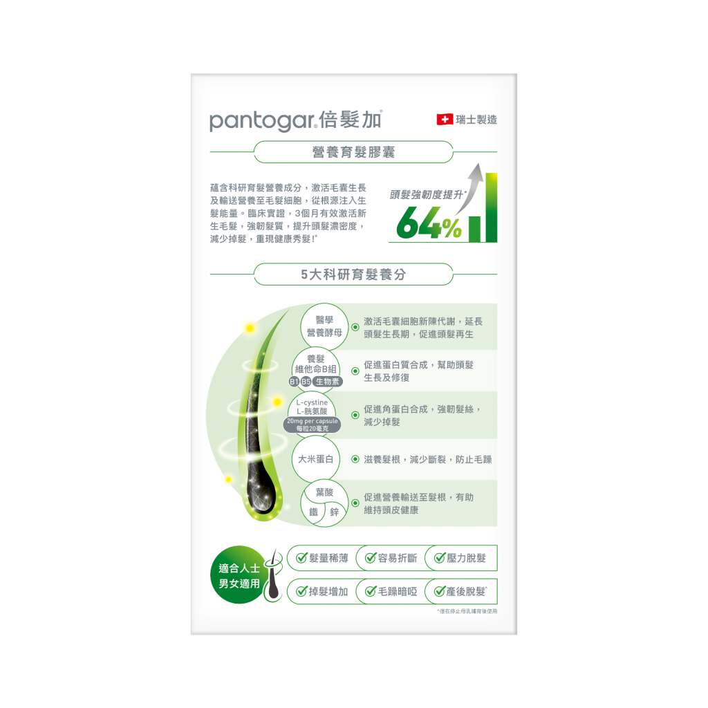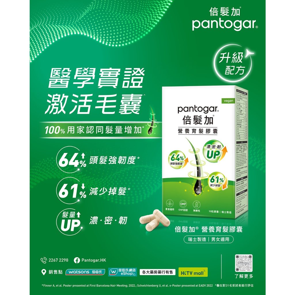 醫學實證,服用3個月有效激活新生毛髮*, 強韌髮質,提升頭髮濃密度,100%用家認同髮量增加*、64% 提升頭髮強韌度*、61% 減少掉髮*!