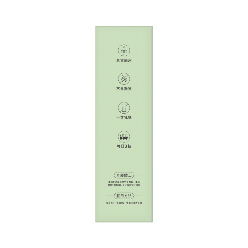 升級配方添加葉酸,鐵,鋅及多種育髮關鍵營養成分,成分天然無藥性,素食適用。產品適合有掉髮、髮量稀薄、髮線後移、或受髮質問題困擾的男女服用。每日3粒即可同時啟動 防脫、修復、育髮 三大效果,由內補足毛囊營養,育出濃密強韌秀髮!