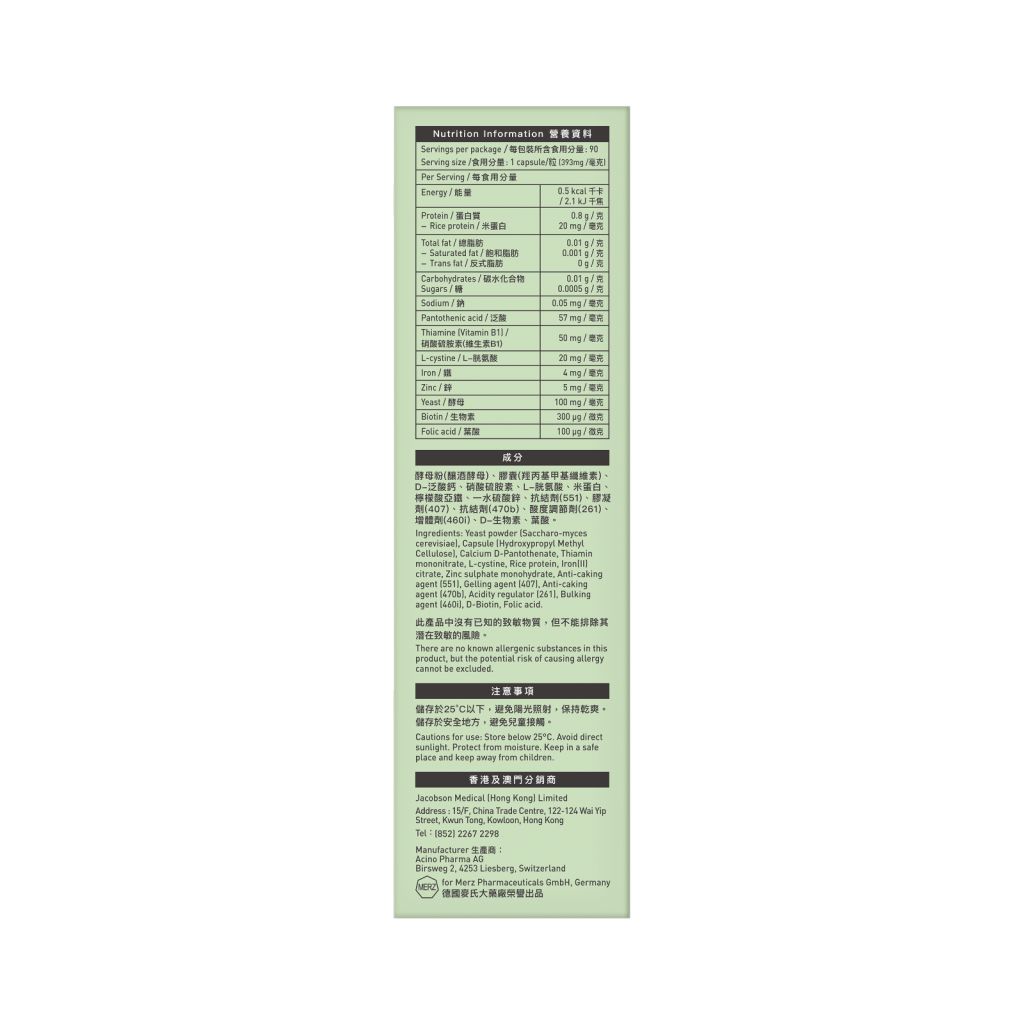 • 多種育髮關鍵營養成分:醫學營養酵母、養髮維他命B組、胱胺酸、大米蛋白、葉酸、鐵、鋅等