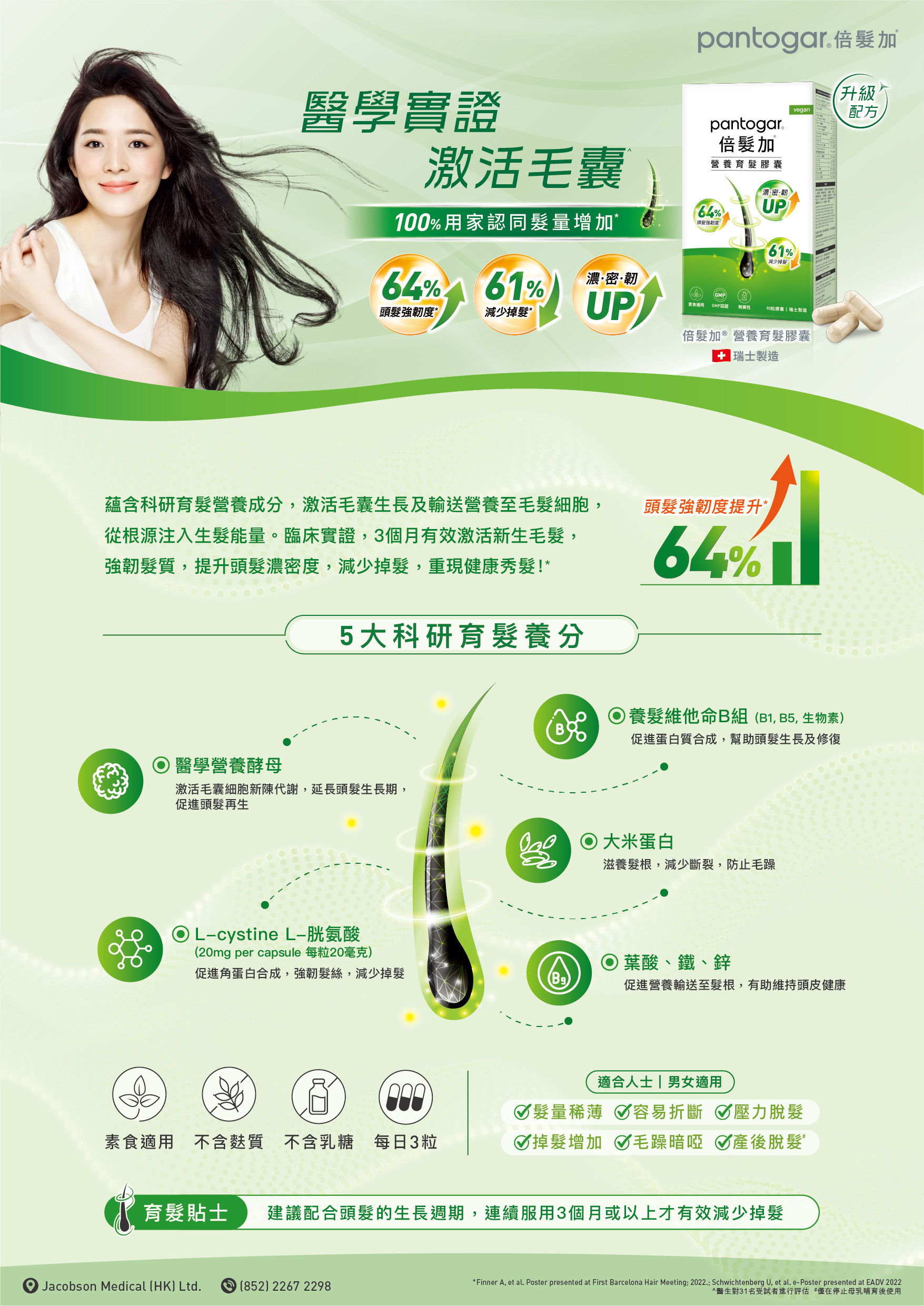 Pantogar® Hair Nutritional Capsules contain five scientifically researched hair growth nutrients that provide sufficient protein and the vitamins and nutrients needed for metabolism. They also help improve microcirculation in the scalp, activate hair follicle growth, and deliver nutrition to hair cells, injecting hair growth energy from the root to enhance weak and damaged hair texture.
