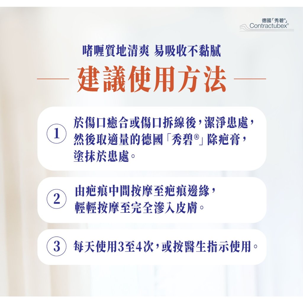 傷口療合後,取適量德國「秀碧®」除疤膏於患處輕輕以小圓圈的動作按摩約1-2分鐘至完全吸收,每天3-4次。 新疤痕建議持續使用3個月;舊疤痕建議持續使用3-6個月。