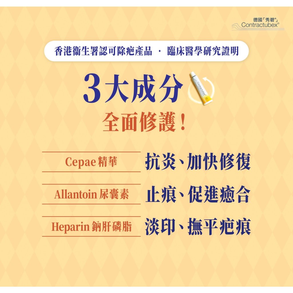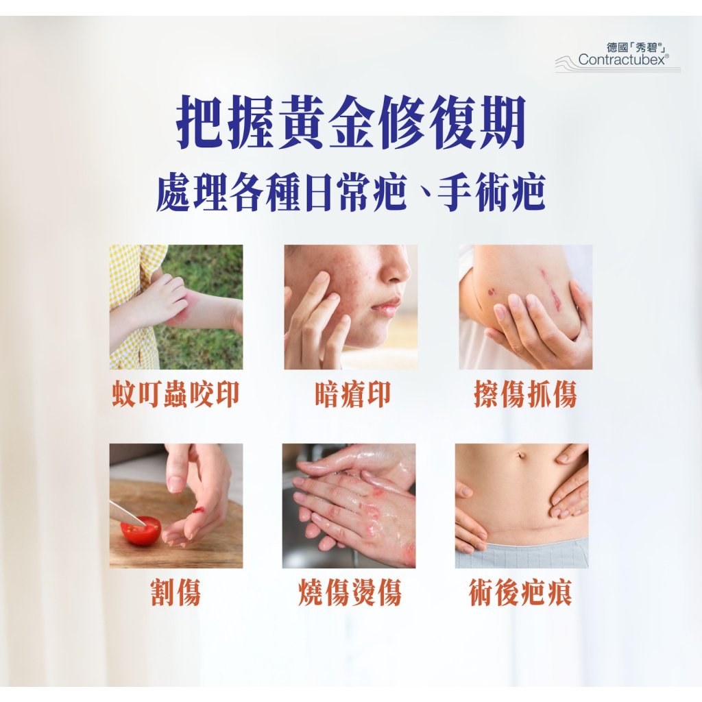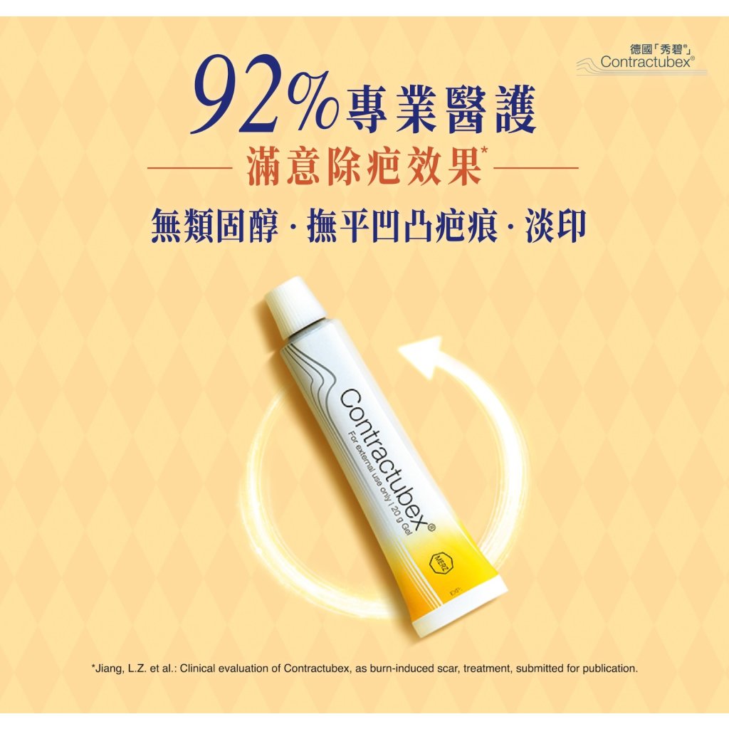 德國 「秀碧®」 除疤膏可對各類疤痕進行極有效的治療,能積極促進皮膚的癒合過程,並從內部減除疤痕形成。含三種活性成分,能深入疤痕,從內部除疤,成效顯著,疤痕幾乎完全看不見。